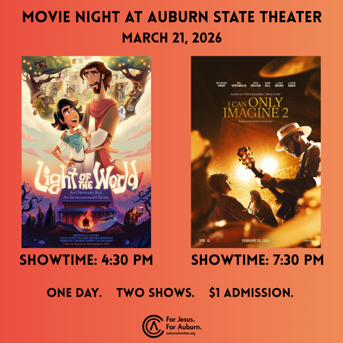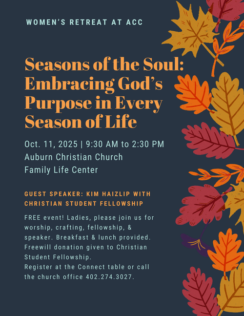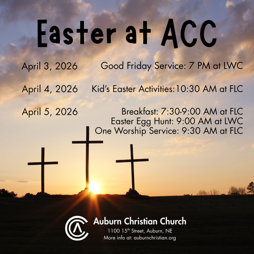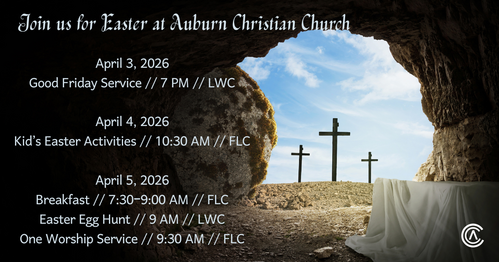 Tithes & Offerings: Feel no pressure to give, but give freely to the mission of the church as God leads you to. Offerings may be placed in the Offering box. If you prefer to give online, please go to the ACC app or auburnchristian.org/give.