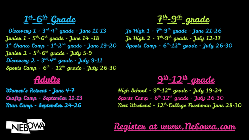 Nebowa Christian Camp is a small, inexpensive, old-school church camp, led by a group of Christian churches in eastern Nebraska and western Iowa. Camp Nebowa exists to provide a camp experience that inspires people of all ages to take the next step in their relationship with Jesus, educate them through biblical teaching and connect them to other believers through lasting friendships and the local church. When you go to camp, you'll attend Bible classes, play group games, enjoy open recreation, lake-front swimming and canoeing, a water slide, chapel and fireside worship.