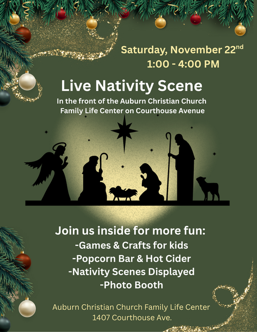 Auburn's Hometown Christmas celebration is Nov. 20-22. On Saturday, Nov. 22, ACC will have a live nativity from 1-4 PM at FLC and a float going through the Holiday Lighted Parade at 5:30 PM. Here are some areas where volunteers are needed: